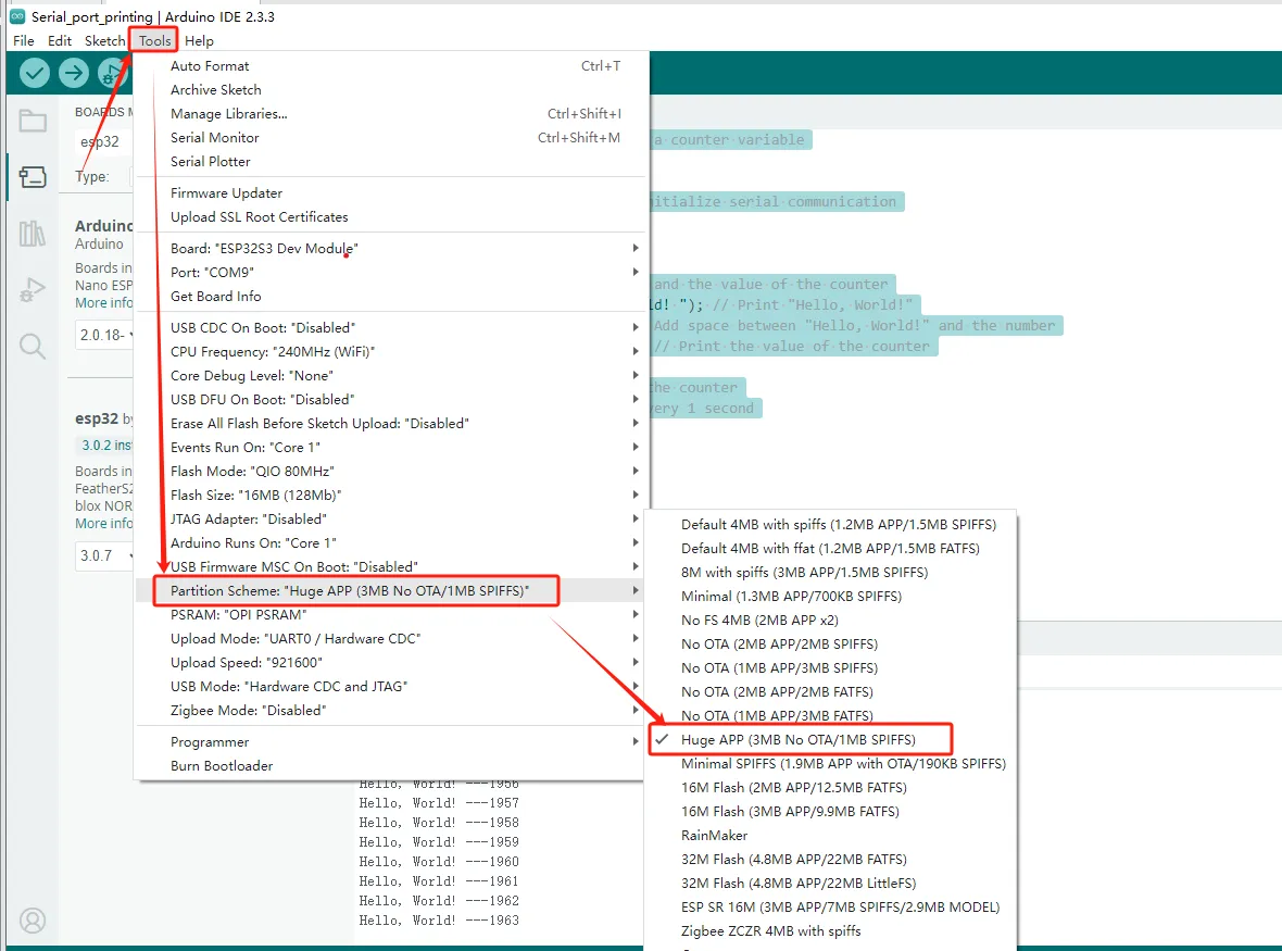 Path:Tools->Partition Scheme->Huge APP (3MB No OTA/1MB SPIFFS)