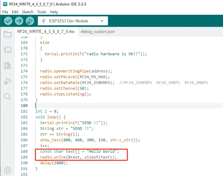 Store the message to be sent in the text variable, and call the radio. Write() function interface to send the text content.
