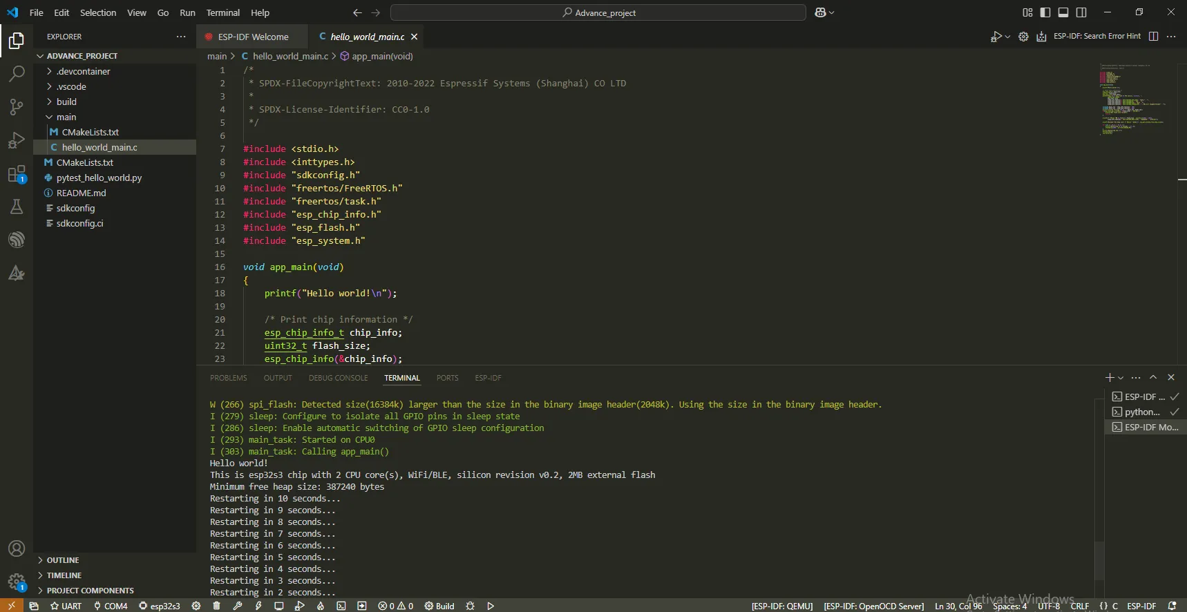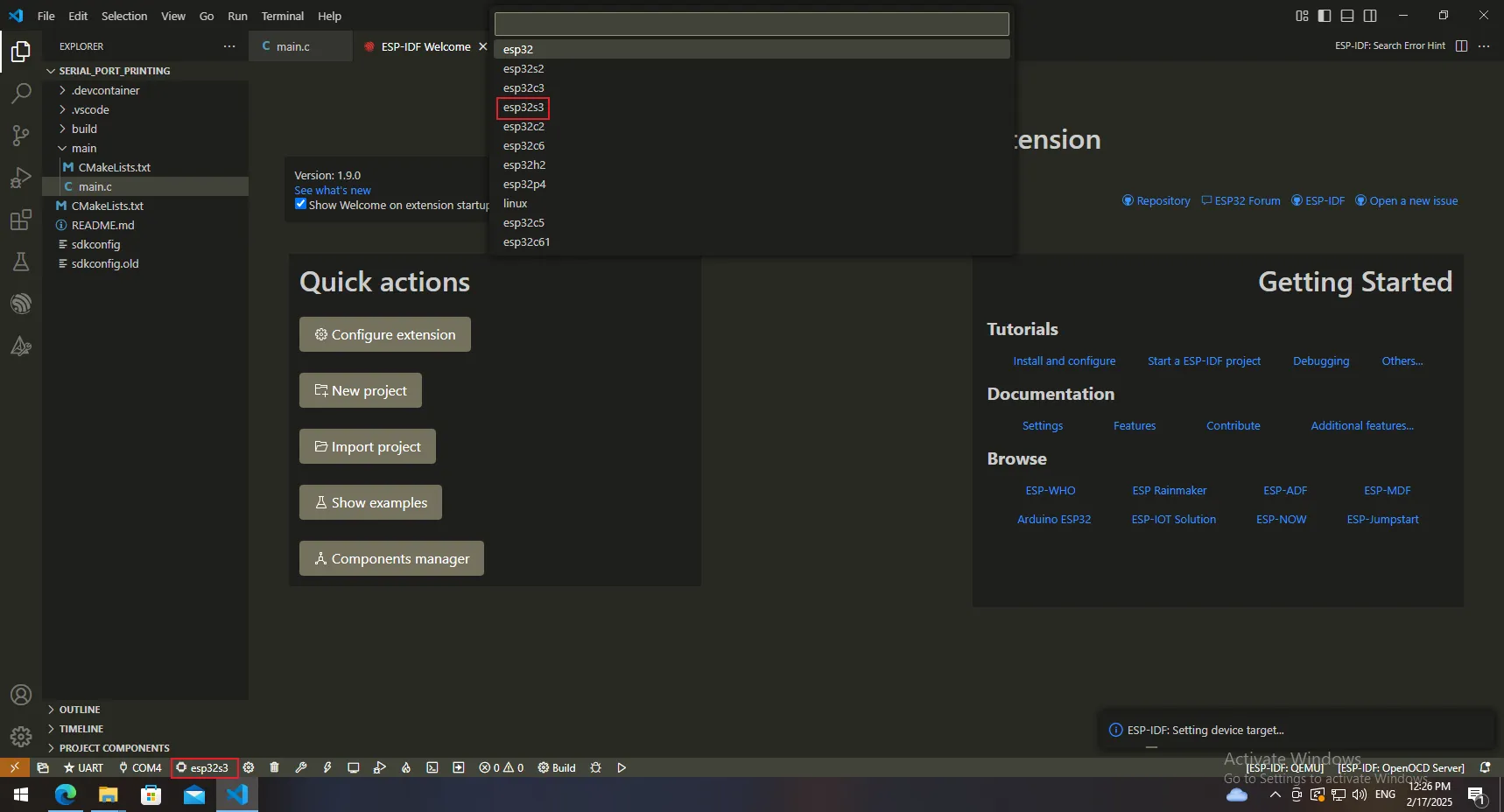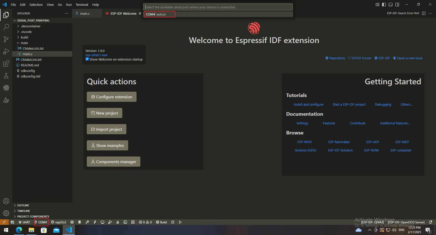 The First Lesson: Installation and Configuration of IDF-IDE and Printing "Hello World" via Serial Port¶