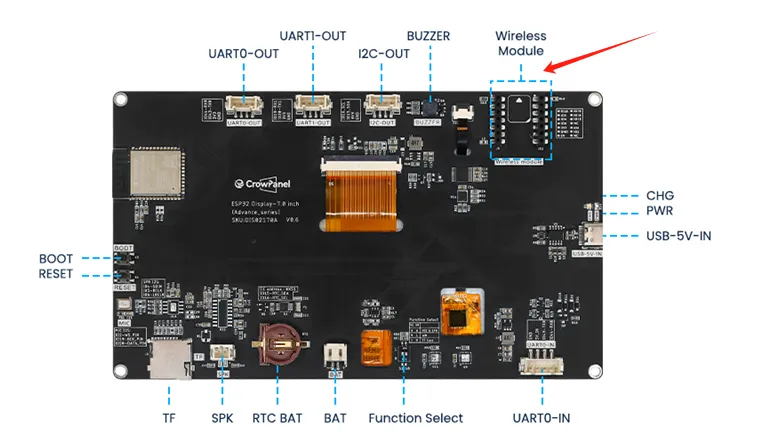 Which combines powerful processing capabilities, diverse peripheral interfaces, and excellent low-power performance. Its integrated 2.4GHz Wi Fi and Bluetooth 5 (LE), combined with the module's built-in RF antenna, ensure the stability of wireless connection, especially suitable for HMI application scenarios with high requirements for wireless connection.