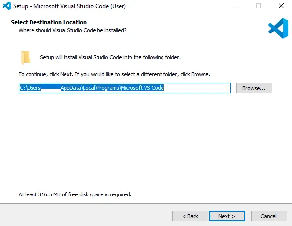 Accept the default location or click 'Browse...' to change the installation location.