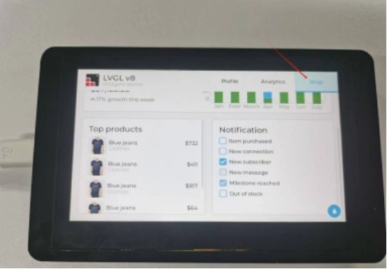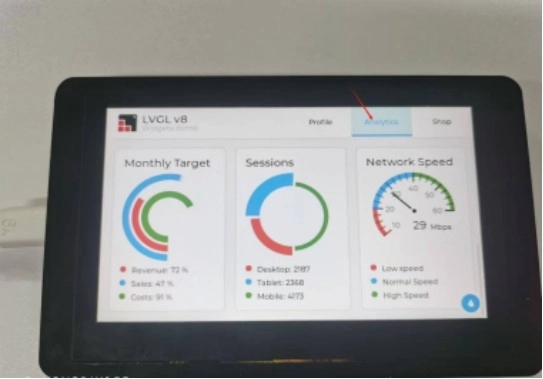 The following interface was generated by introducing the official firmware of LVGL, and the specific operation will not be explained in this lesson for now. In the next class, we will mainly explain the LVGL graphics library. You can follow our updates to facilitate your learning.