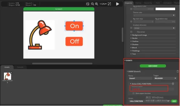 Similarly, add an event to the Off button. The operation process is the same as above.