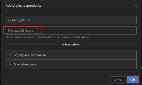 Select version 8.3.11 (which needs to correspond to the version selected when creating the project in SquareLine Studio), and click "Add to Project".