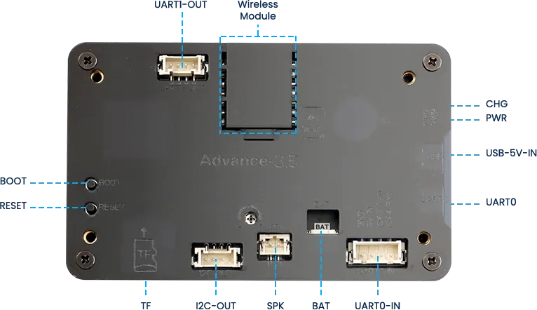 I2C-OUT interface: connects RTC chip, extended IO chip (for screen backlight, touch screen reset, power amplifier pin control) and wireless module, only supports I2C communication.