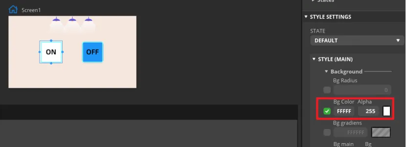 In "Inspector"->"STYLE SETTINGS"->"STATE", set display white background color by DEFAULT and red when on the PRESSED state.