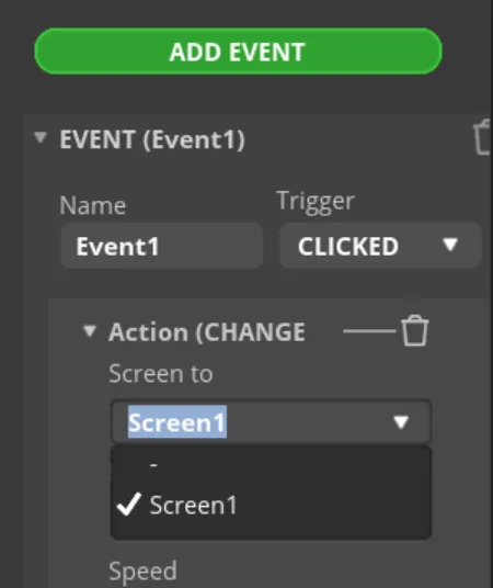 Complete the event. Here I choose to change the screen, and the screen to be switched is Screen1.