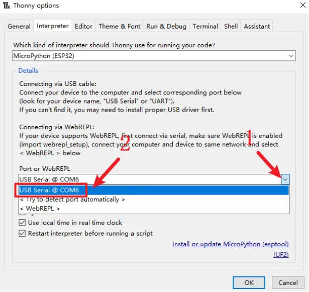 Open Thonny IDE and click "Tools"->"Options"->"Interpreter".