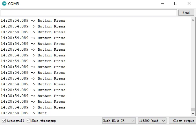 Serial.println("Button Press"); // Print a message when the button is pressed