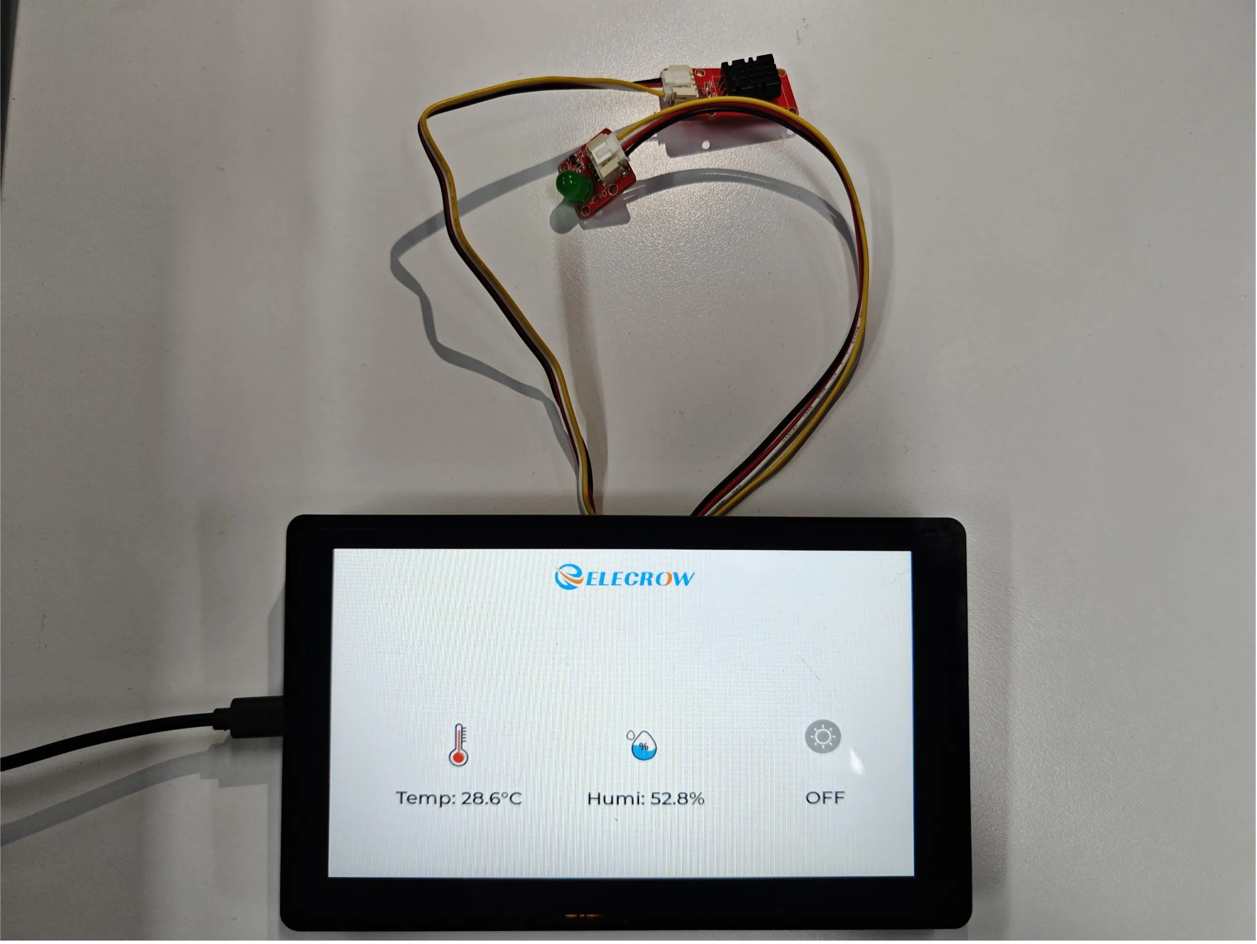 Note: Due to a hardware circuit issue with the 2.8-inch and 2.4-inch Crowpanel Advance ESP32 HMI Displays, the I2C address of the touchscreen conflicts with that of the DHT20 temperature and humidity sensor, making both unusable when connected simultaneously. Therefore, for the 2.8-inch and 2.4-inch displays, we only use the UART1-OUT interface to connect the DHT20 sensor, and the light bulb is not used with these two sizes. For other sizes, such as 7.0-inch, 5.0-inch, 4.3-inch, and 3.5-inch displays, both the DHT20 sensor and the small light bulb can be used.