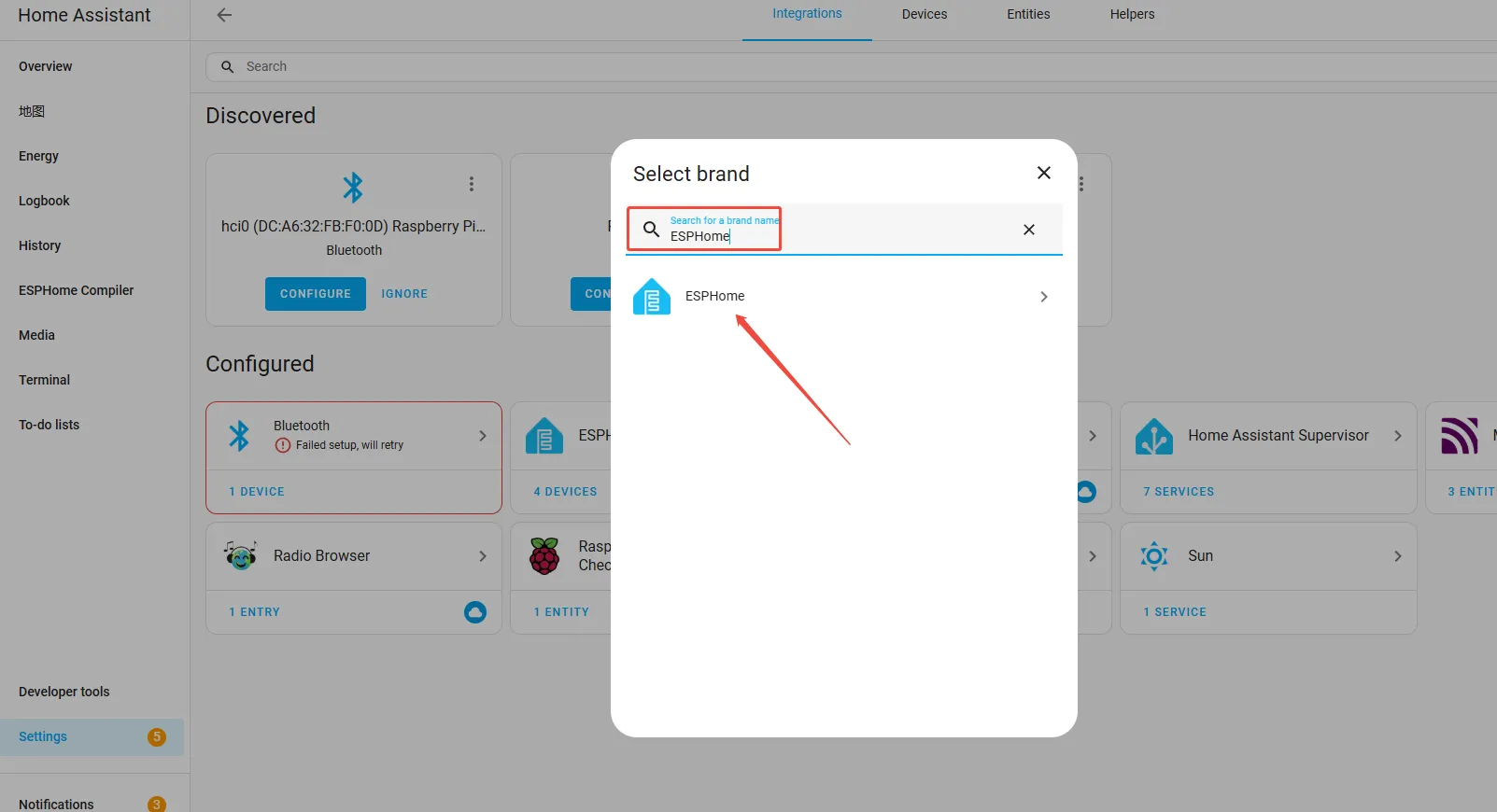Click Settings → Devices & Services → Add Integration, then enter 'ESPHome' and click on it.