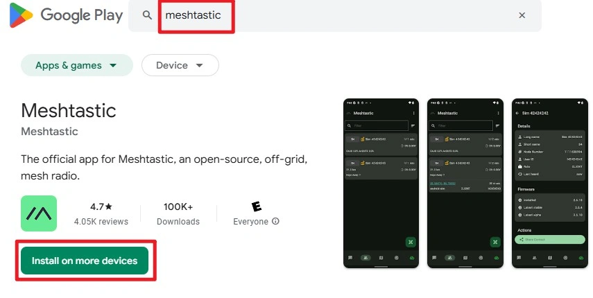 1: Visit the Google Play Store (https://play.google.com/), search for ‘meshtastic’, locate the app, and download it for installation.