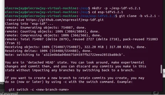 Enter the command line in the terminal and clone the IDF of version v5.2.1 into this folder.