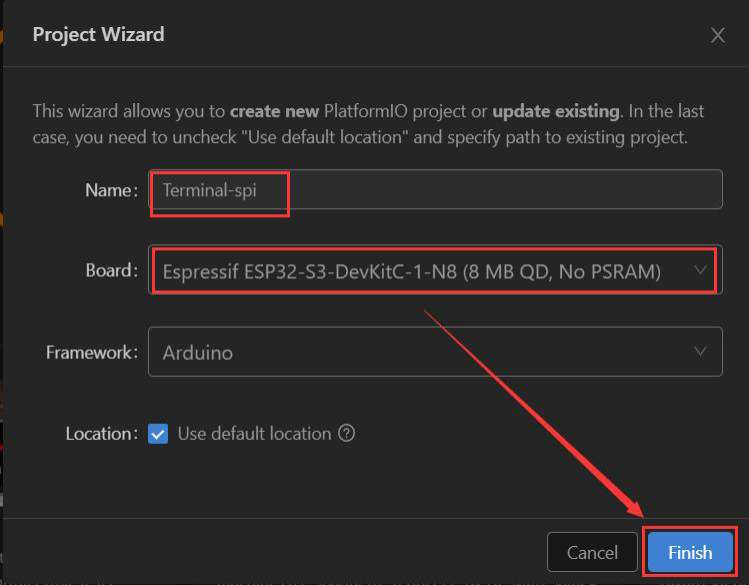 Add the project name. The board select "ESP32-S3-DevKitC-1-N8(8 MB QD, No PSRAM)", framework select Arduino