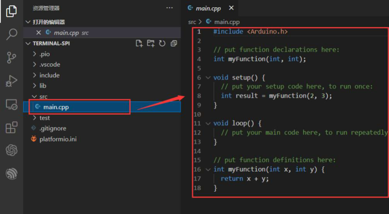 After the configuration is complete, write the code in main.cpp. ![]()